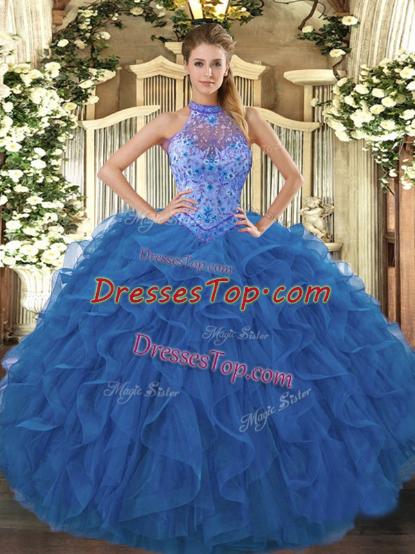 Inexpensive Halter Top Sleeveless Quinceanera Dress Floor Length Beading and Embroidery and Ruffles Blue Organza
