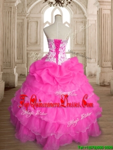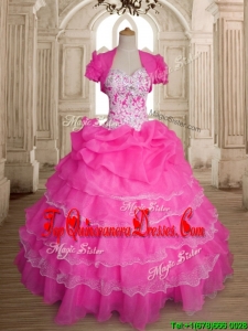Inexpensive Hot Pink Organza Quinceanera Dress with Ruffled Layers and Beading