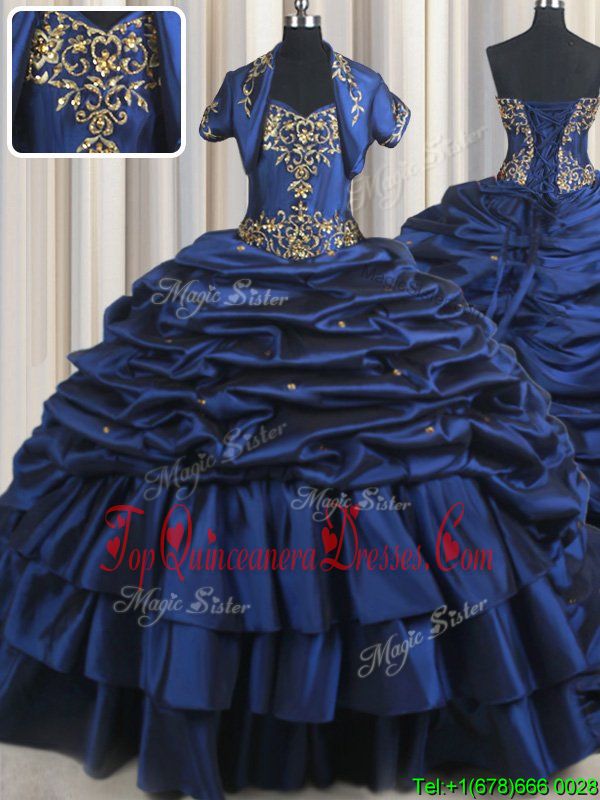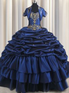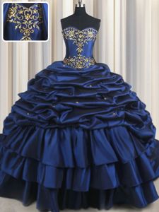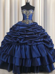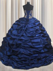 Inexpensive Navy Blue Lace Up Quinceanera Dresses Embroidery and Pick Ups Sleeveless With Train Court Train