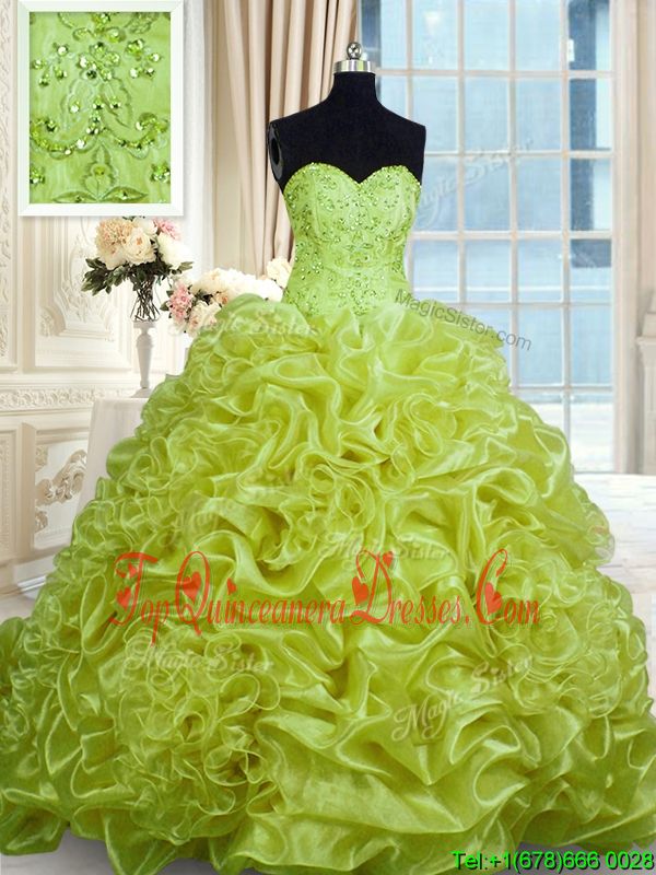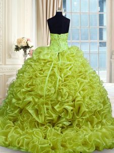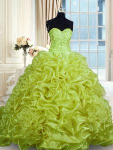 Inexpensive Olive Green Sleeveless With Train Beading and Pick Ups Lace Up Quinceanera Gown