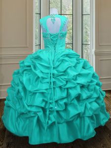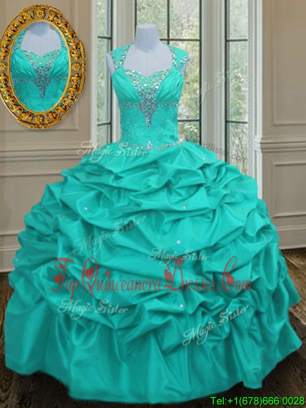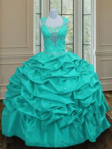 Inexpensive Straps Straps Aqua Blue Lace Up Quince Ball Gowns Beading and Pick Ups Sleeveless Floor Length