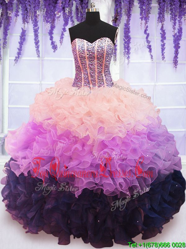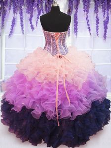 Inexpensive Sweetheart Sleeveless Organza Quinceanera Dresses Beading and Ruffles and Ruffled Layers Lace Up