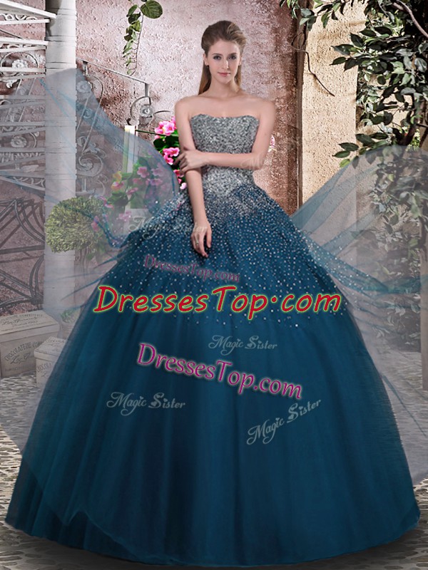Inexpensive Teal Tulle Lace Up Quinceanera Gown Sleeveless Floor Length Beading