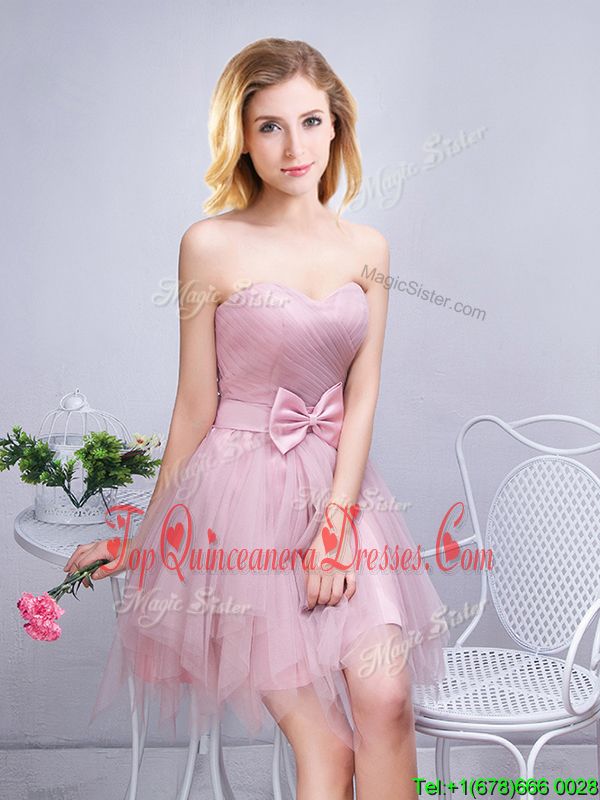 Inexpensive Tulle Sleeveless Mini Length Vestidos de Damas and Ruching and Bowknot