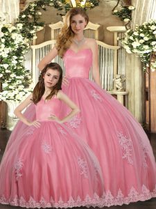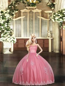 Inexpensive Watermelon Red Ball Gowns Appliques Quinceanera Dress Lace Up Tulle Sleeveless Floor Length