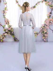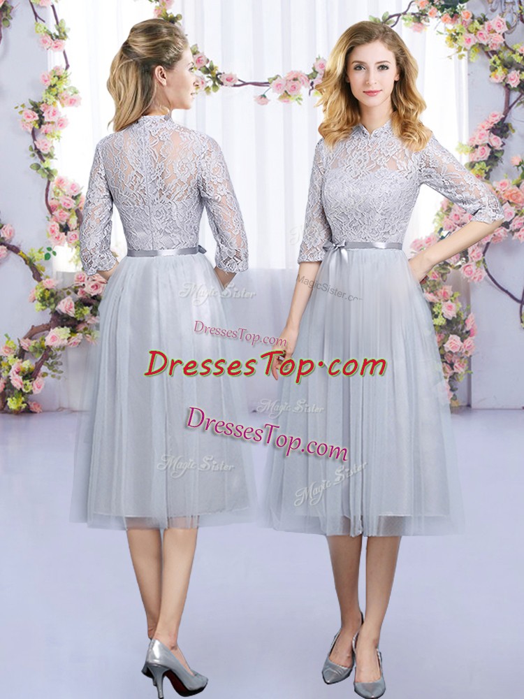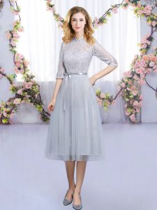 Lace and Belt Vestidos de Damas Grey Zipper Half Sleeves Tea Length