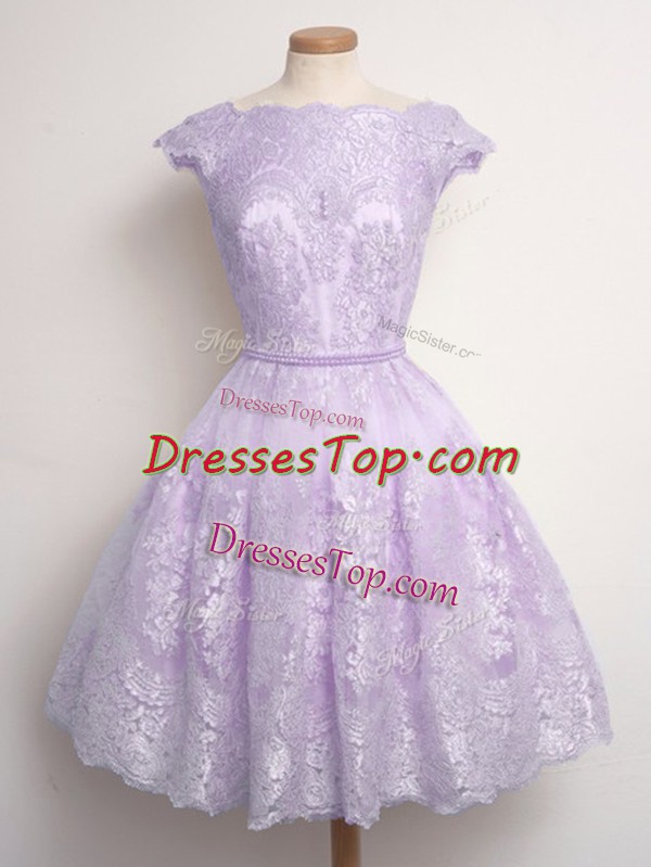 Lace Quinceanera Court of Honor Dress Lavender Lace Up Cap Sleeves Knee Length