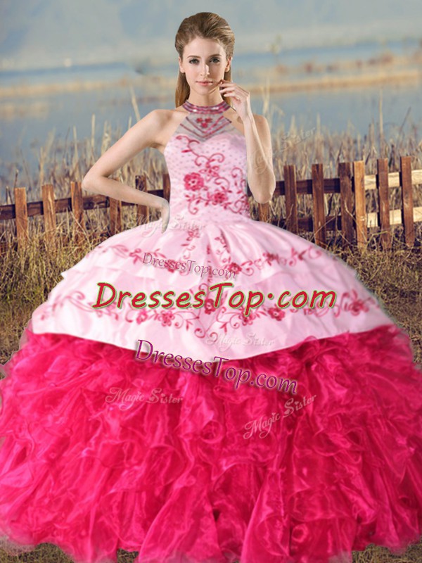 Lace Up 15 Quinceanera Dress Hot Pink for Sweet 16 and Quinceanera with Embroidery and Ruffles Court Train