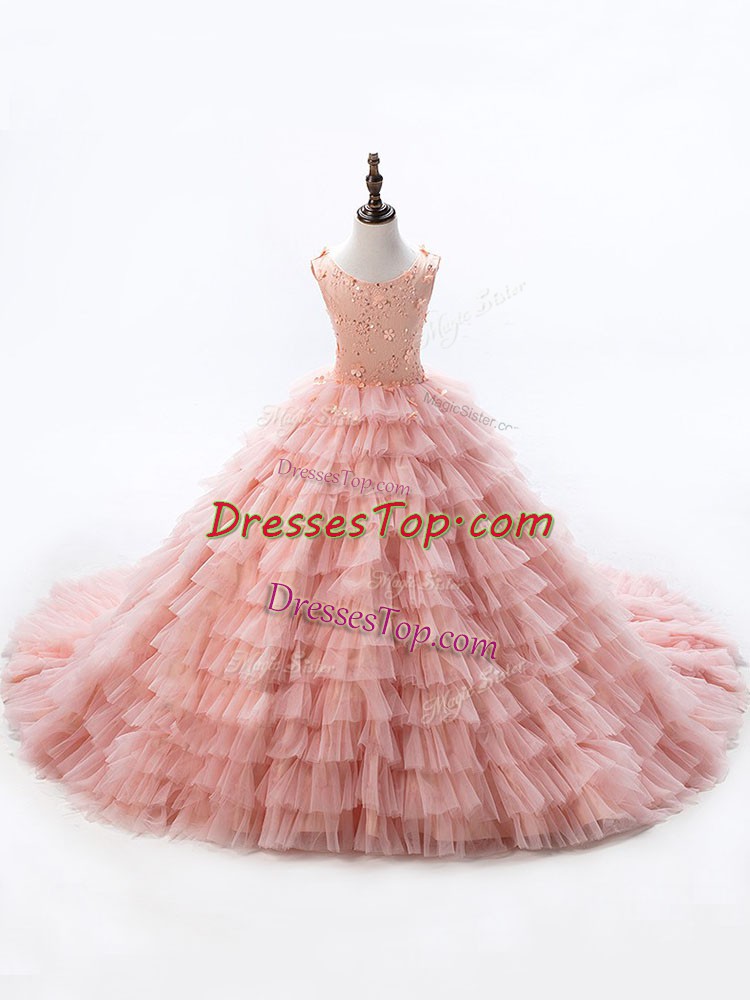 Lace Up Little Girls Pageant Dress Pink for Wedding Party with Beading and Ruffled Layers Court Train