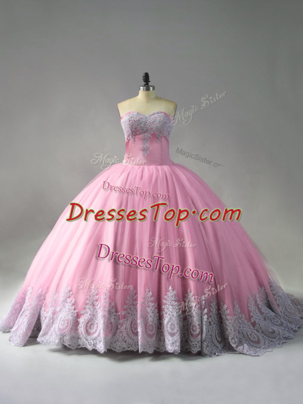 Lace Up Quinceanera Dresses Pink for Sweet 16 and Quinceanera with Beading and Appliques Court Train