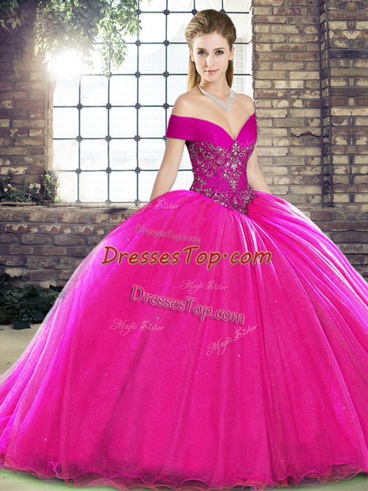 Lace Up Vestidos de Quinceanera Fuchsia for Military Ball and Sweet 16 and Quinceanera with Beading Brush Train