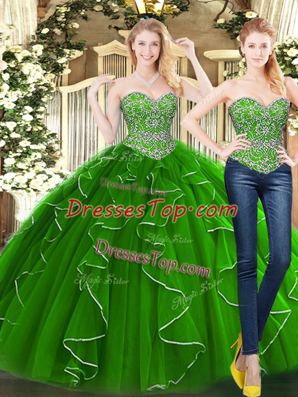 Latest Beading and Ruffles Quinceanera Gowns Green Lace Up Sleeveless Floor Length