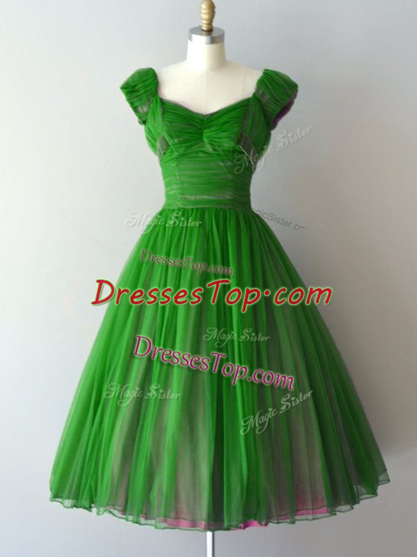 Latest Cap Sleeves Knee Length Ruching Lace Up Damas Dress with Green