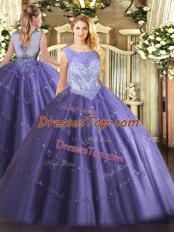 Latest Floor Length Lavender Quince Ball Gowns Tulle Sleeveless Beading