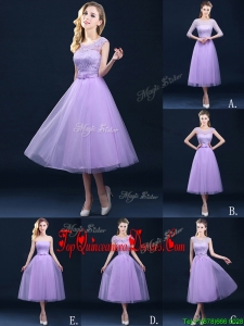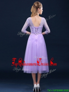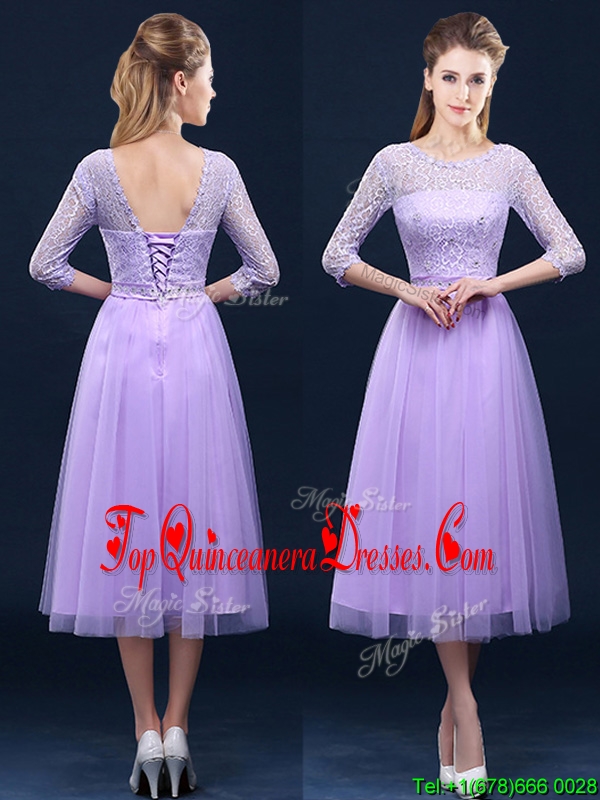 Latest Half Sleeves Tea Length Laced Damas Dress in Lavender
