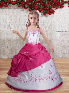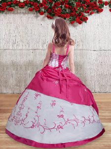 Latest Hot Pink Ball Gowns Taffeta Straps Sleeveless Embroidery Floor Length Lace Up Girls Pageant Dresses