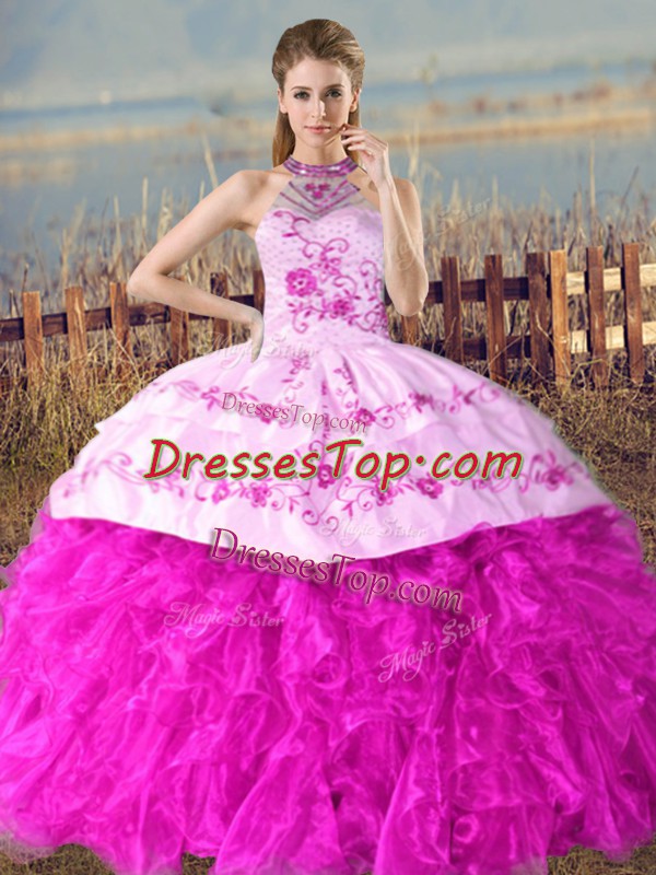 Latest Organza Halter Top Sleeveless Court Train Lace Up Embroidery and Ruffles Quinceanera Dresses in Fuchsia