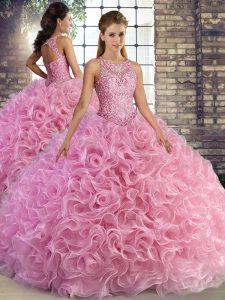 Latest Rose Pink Sleeveless Fabric With Rolling Flowers Lace Up Sweet 16 Dress for Military Ball and Sweet 16 and Quinceanera