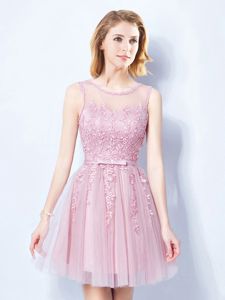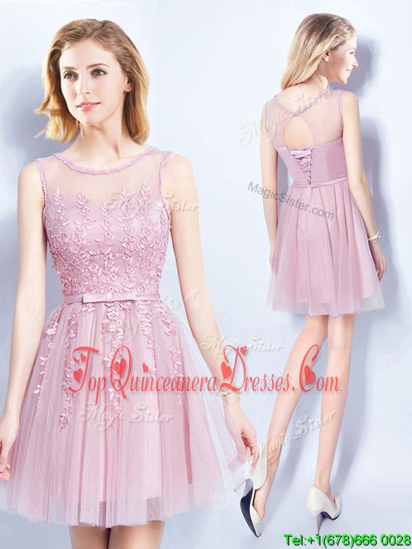 Latest Scoop Pink Sleeveless Mini Length Appliques and Belt Lace Up Quinceanera Court of Honor Dress