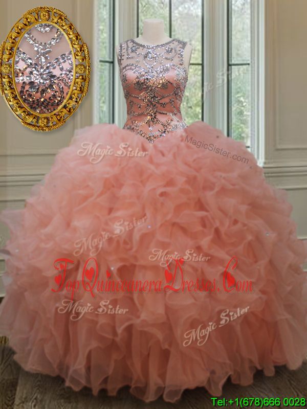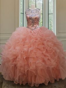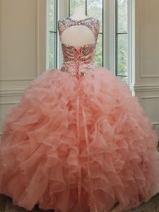Latest Scoop See Through Peach Sleeveless Organza Lace Up 15th Birthday Dress for Military Ball and Sweet 16 and Quinceanera
