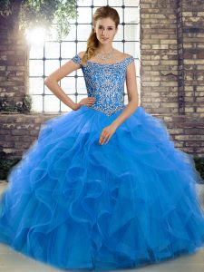 Latest Sleeveless Brush Train Beading and Ruffles Lace Up Sweet 16 Dress