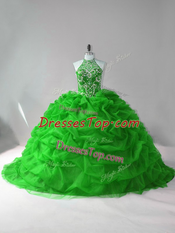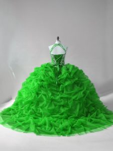 Latest Sleeveless Organza Court Train Lace Up Quinceanera Dresses in Green with Beading and Pick Ups