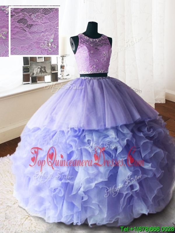 Latest Sleeveless Sweep Train Beading and Ruffles Lace Up Quince Ball Gowns