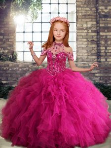 Latest Tulle High-neck Sleeveless Lace Up Beading and Ruffles Little Girls Pageant Dress in Fuchsia