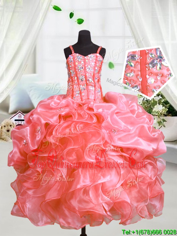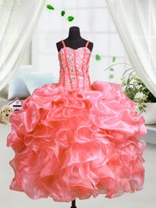 Latest Watermelon Red Organza Lace Up Little Girls Pageant Dress Wholesale Sleeveless Floor Length Beading and Ruffles