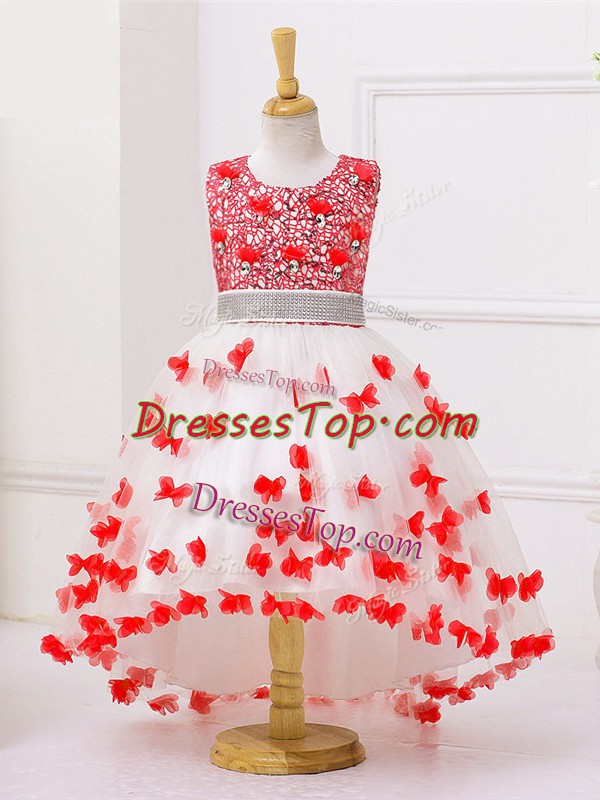 Latest White And Red Tulle Zipper Scoop Sleeveless High Low Child Pageant Dress Appliques and Sequins