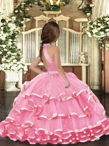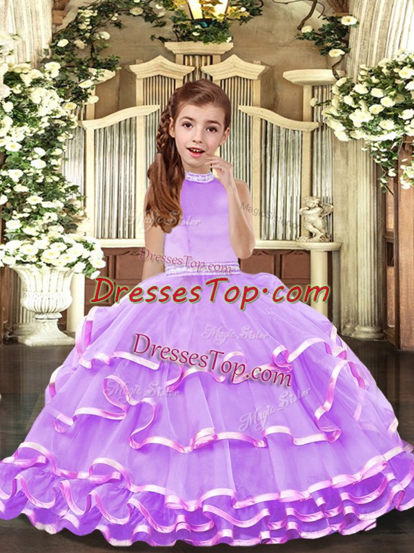 Lavender Ball Gowns Halter Top Sleeveless Organza Floor Length Backless Beading and Ruffled Layers Little Girl Pageant Dress