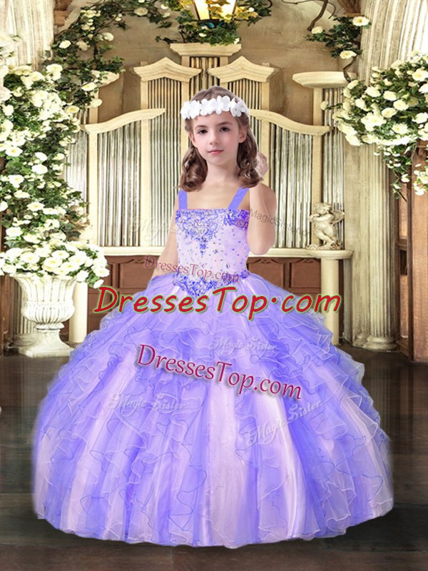 Lavender Ball Gowns Organza Straps Sleeveless Beading and Ruffles Floor Length Lace Up Little Girls Pageant Gowns