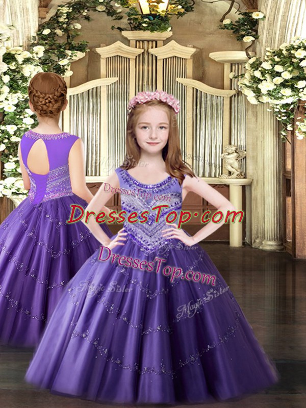 Lavender Ball Gowns Scoop Sleeveless Tulle Floor Length Lace Up Beading Pageant Dress for Girls
