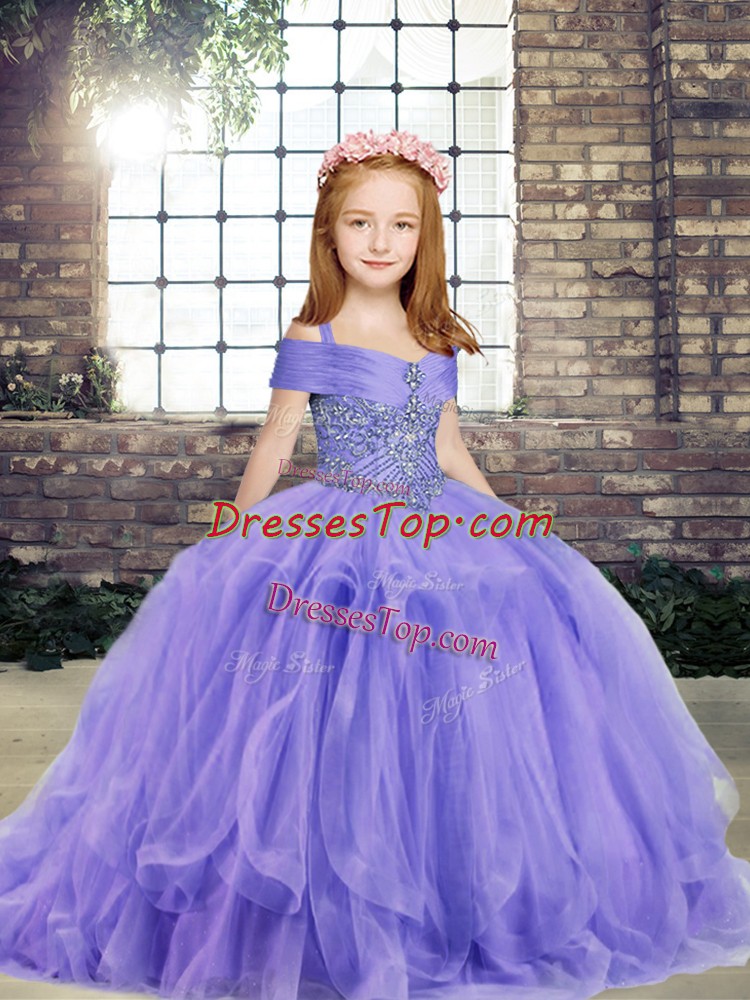 Lavender Ball Gowns Taffeta and Tulle Off The Shoulder Sleeveless Beading Floor Length Lace Up Kids Formal Wear