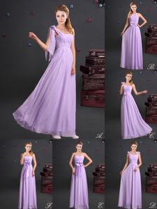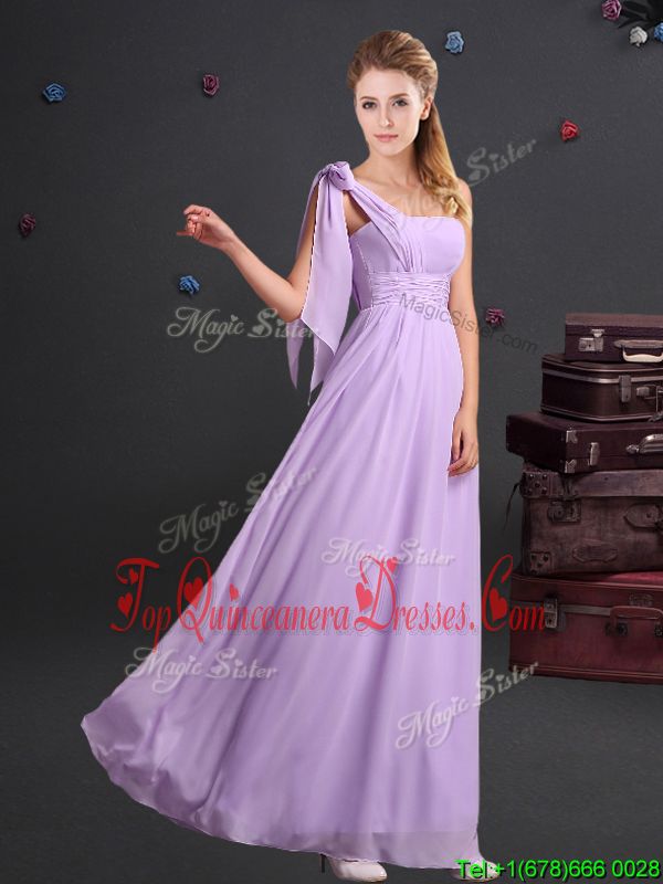 Lavender Chiffon Zipper One Shoulder Sleeveless Floor Length Dama Dress for Quinceanera Ruching