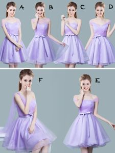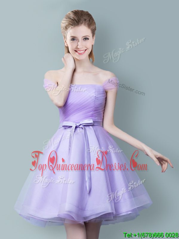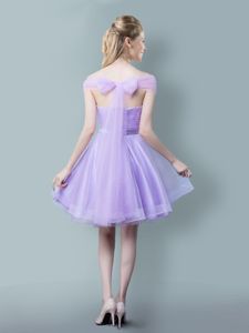 Lavender Empire Off The Shoulder Sleeveless Tulle Knee Length Zipper Ruching and Bowknot Quinceanera Court Dresses