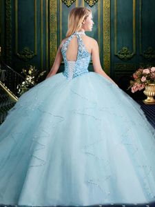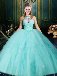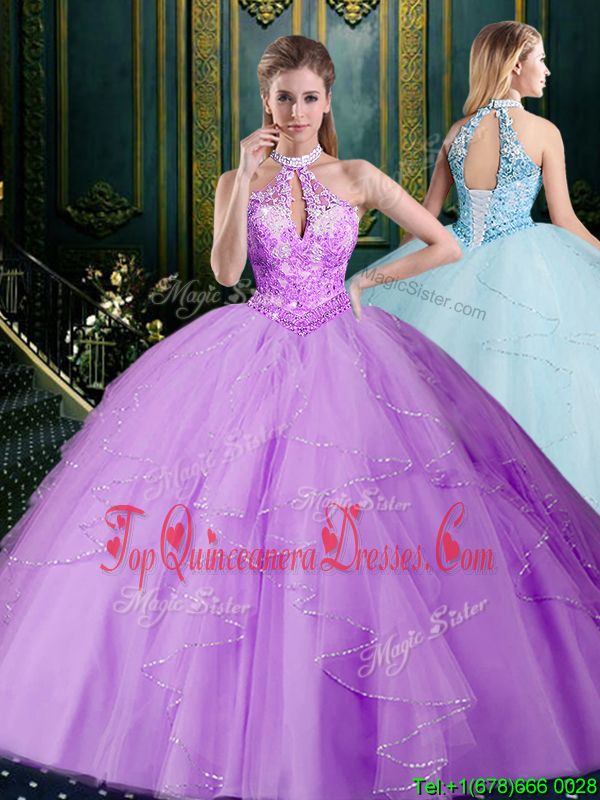 Lavender Halter Top Lace Up Beading and Lace and Appliques and Ruffles and Pick Ups Sweet 16 Dresses Brush Train Sleeveless