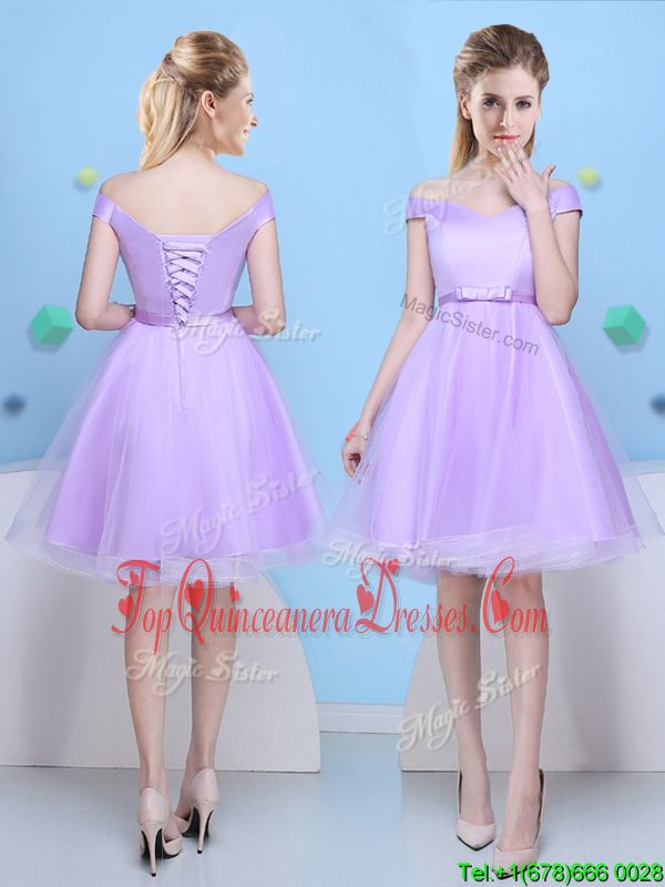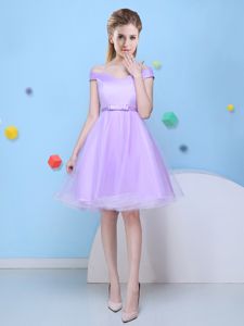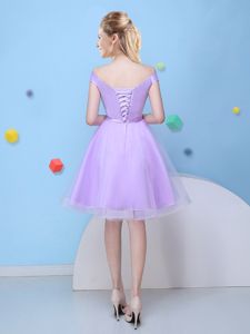 Lavender Lace Up V-neck Bowknot Court Dresses for Sweet 16 Tulle Cap Sleeves