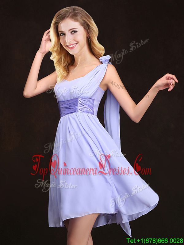 Lavender One Shoulder Neckline Ruching and Hand Made Flower Quinceanera Court Dresses Sleeveless Zipper