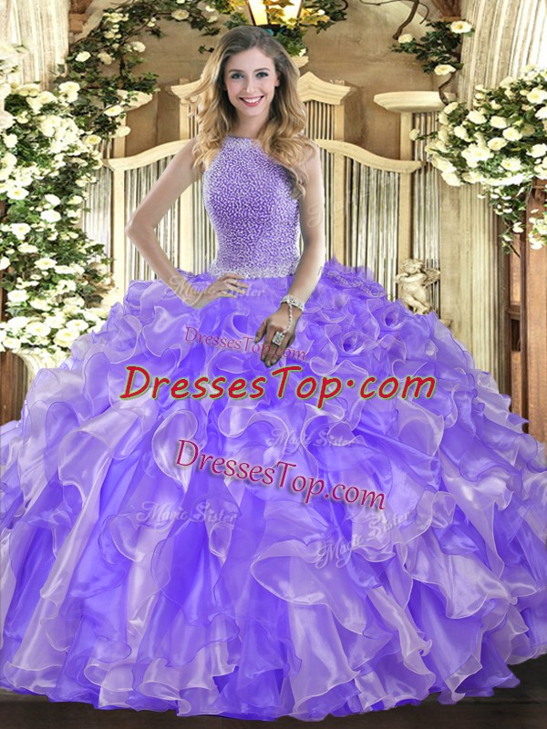 Lavender Organza Lace Up High-neck Sleeveless Floor Length Vestidos de Quinceanera Beading and Ruffles