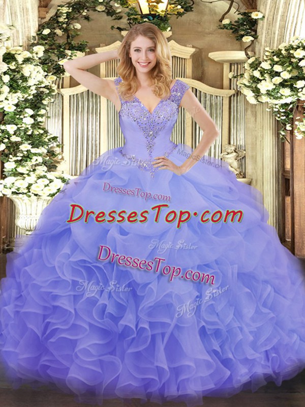 Lavender Organza Lace Up V-neck Sleeveless Floor Length Sweet 16 Quinceanera Dress Ruffles
