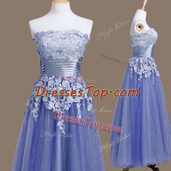 Lavender Sleeveless Tea Length Appliques Lace Up Court Dresses for Sweet 16