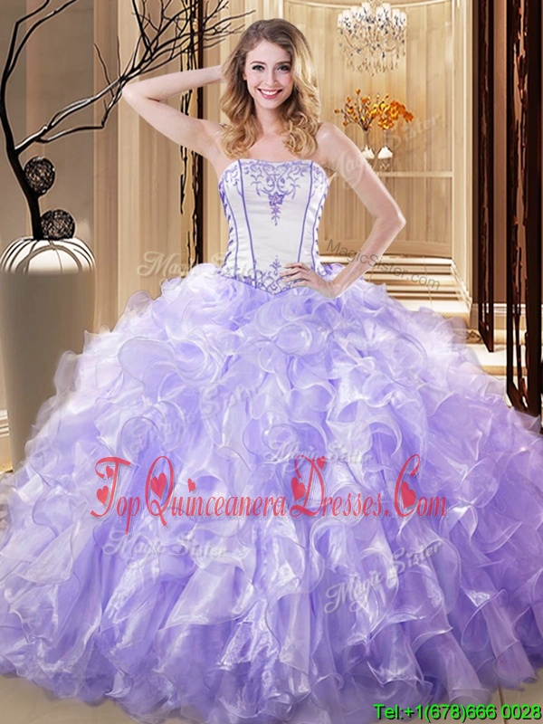 Lavender Strapless Neckline Embroidery and Ruffles Quince Ball Gowns Sleeveless Lace Up