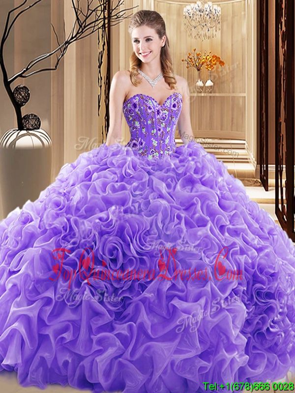 Lavender Sweet 16 Dresses Prom and Military Ball and Sweet 16 and Quinceanera and For with Embroidery and Ruffles and Pick Ups Sweetheart Sleeveless Court Train Lace Up