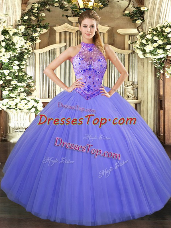 Lavender Tulle Lace Up Halter Top Sleeveless Floor Length Quinceanera Gown Beading and Embroidery