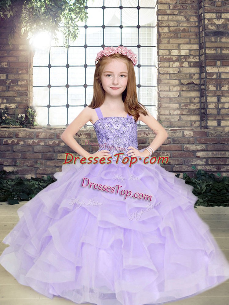 Lavender Tulle Lace Up Little Girls Pageant Gowns Sleeveless Floor Length Beading and Ruffles