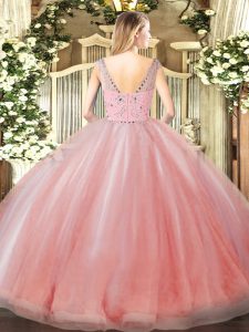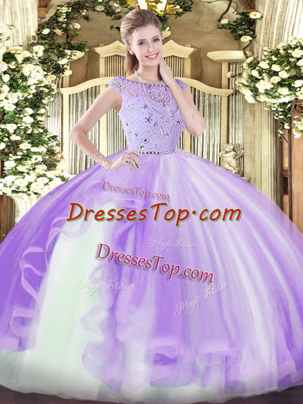 Lavender Tulle Zipper 15th Birthday Dress Sleeveless Floor Length Beading and Ruffles