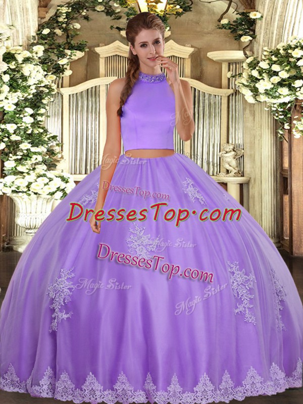 Lavender Two Pieces Beading and Appliques Quinceanera Dress Backless Tulle Sleeveless Floor Length