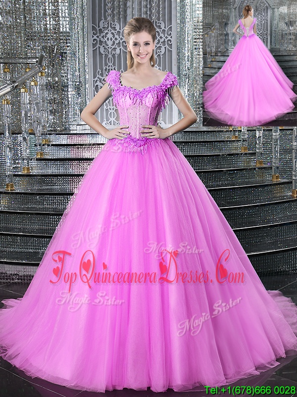 Light Blue Ball Gowns Straps Sleeveless Tulle With Brush Train Lace Up Beading and Appliques Quince Ball Gowns