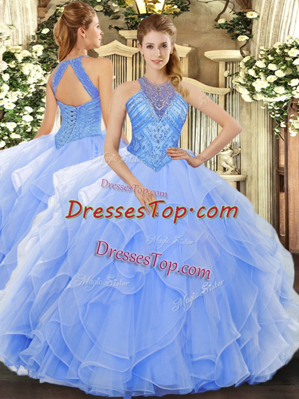 Light Blue Organza Lace Up 15th Birthday Dress Sleeveless Floor Length Beading and Ruffles
